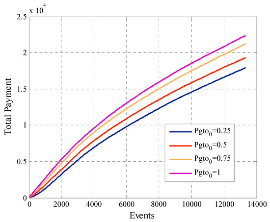 Figure 14 shows the total payment of the platform. The linear growth of the curves occurs because a considerable number of active users continues to participate when requested. In the first participations, the angular coefficient of the curves is greater since there still are variations in the payments for participation of each user. Once the payments for each user stabilize the slope of the curve decreases and remains constant. The configuration that has is the one that has the highest total payment although is the one that has the least amount of participant users. This is because when is greater, the participation payment converges at a higher value than in the case where is lower.