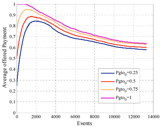 Another factor that the system designer must consider is the average offered payment. In Figure 16 we can see that in this case there is a direct relationship between this metric and the initial payment . Since, when we compare the behavior of two configurations, the one with the highest value of will have the average offered payment greater at all times. In the case of the curves with equal to 0.25, 0.5 and 0.75 we see how in the first requests of information the average offered payment increases. This is because in the phase one of the mechanism the offered payment increases if the user not participates in the system. When the number of events rises, the platform tries to reduce the payment of the participant users to find the minimum payment that allows the participation for each user. For this type of model, the best option is to start offering a lower payment, since an initial higher payment at the start does not bring greater benefits and raise project costs.