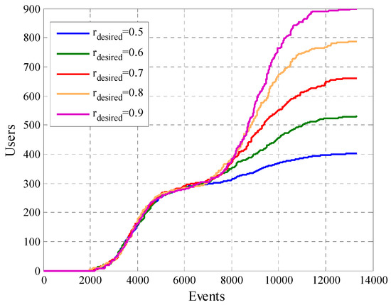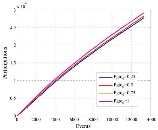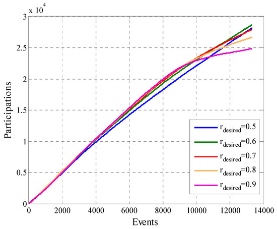 We conducted simulations for the different values of . All the simulations considered . First, we analyze the number of participant users of the system. In Figure 12 we can see that the number of removed participants does not show a significant or well-defined change for the different configurations of . The model removes around 40% of the participants in this case. The elimination mask gives the shape of the curve; we can observe that when the number of events increases, the number of removed participants is higher. This is because at this point users had reached the number of participations that allows the model to compare it with the second constraint of the removal mask. The higher the number of events, the greater the likelihood that each user reaches the number of attempts to be compared with the second constraint of the mask.