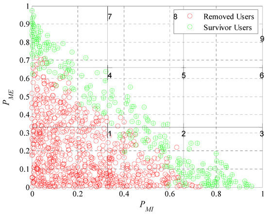 In these graphical representations, we can also observe the presence of some specific errors in the identification of the type of user, as in Figure 22, where there is a participant user in the lower left quadrant that the platform should have removed. We can define that an error occurs when: (i) A user is considered an active participant having his probability of cooperation lower than the restrictive criterion of the removal mask or when (ii) a user is removed having his probability of cooperation greater than the restrictive criterion of the removal mask. Remembering that we define the probability of cooperation in Equation (5) and is equal to the sum of and . Table 2 shows the number of errors for each case. In the first column we see the different values use for . In the second column, we tabulated the removal errors (users erroneously removed). While in the third column, the participation errors (users erroneously active) can be found. In the last column of Table 2 we can see the percentage of errors occurred in relation to the total number of users. With this data it was possible to show that the incentive model can correctly determine the type of user over 92% of the times for the case where . In the case of the model determines correctly the type of user more than 95% of the times. Proving that the number of errors is small when compared to the total number of decisions taken. It is also proven that when is higher the amount of errors will be lower.