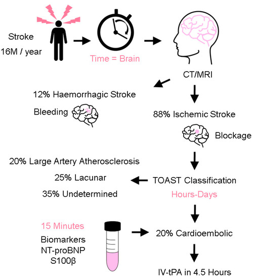 Stroke is the second leading cause of death globally [1] and is a costly disease from a human, economic, and societal perspective [2]. Annually, there are more than 16 million stroke cases, and an estimated 6.7 million people die from stroke globally [3]. Given that age is a significant risk factor for stroke, the burden of stroke is likely to increase further as the global population ages. The efficacy of stroke treatment is highly dependent on a timely diagnosis and administration of treatment [4,5]. It is thought that approximately 1.9 million neurons die every minute following the onset of cerebral ischemia [6]. Triage of patients into two stroke mechanisms (ischemic and hemorrhagic) is important as their treatment is markedly different; treatment of patients with ischemic stroke centers around fibrinolytic drugs that, when administered in wrongly-selected patients, could aggravate the extent of bleeding in patients with a hemorrhagic stroke (Figure 1). Ischemic stroke accounts for approximately 88% of stroke cases and is further classified into cardioembolism, large artery atherosclerosis, lacunar, and undetermined causes [7,8]. Cardioembolic strokes are generally more severe, prone to reoccurrence, and account for 20% of ischemic stroke cases. Early recognition of stroke mechanisms is important to explain how strokes occur and to select appropriate secondary stroke prevention treatment. As patients with cardioembolic stroke tend to do poorly, prompt treatment with acute reperfusion strategies is necessary to arrest the initial cascade and downstream consequences of cerebral ischemia. Current methods of reperfusion treatment center around the use of intravenous recombinant tissue plasminogen activator (IV-tPA) and endovascular thrombectomy to either lyse, retrieve, or aspirate the culprit thrombus [9]. Existing methods to elucidate stroke mechanisms rely on the use of clinical examination and information derived from neuroimaging investigations such as CT and MRI brain scans [10]. Despite extensive investigations, stroke mechanisms could still not be determined in ~35% of patients, highlighting the biological complexity of stroke pathophysiology. Existing methods to elucidate stroke mechanisms can take days to weeks, depending on the timely access and availability of neuroimaging, prolonged electrocardiographic, and transesophageal echocardiogram investigations [11,12].