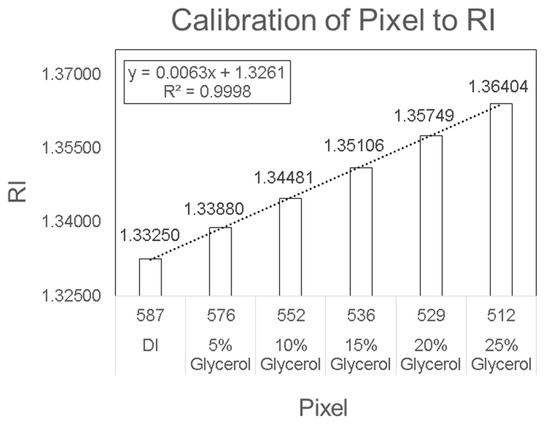 The detection system was factory-calibrated and did not require any user intervention. However, there could be cases where calibration was lost. The device can then be recalibrated by measuring the pixel value of different concentrations of glycerol (5% v/v–25% v/v) diluted in deionized (DI)-water (Figure 3). Then, the pixel was analyzed according to the solution’s known RI value. DI water was used in the reference channel. The PhotonicSys SPR H5 recognizes the shift in RI through monitoring the shift in the dark line location in pixels. The shift in RI was measured by a camera and line detection algorithm integrated within the SPR device that identifies a change in pixels, which is then translated into a shift in RI based on the device pre-calibration.