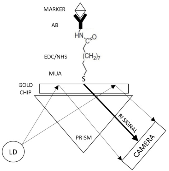 In this study, a functionalized SPR chip is developed for the specific detection of stroke biomarkers using an SPR POC device. This is the first time SPR technology is utilized as a POC device for the detection of blood-based biomarkers. SPR sensing technology is well known for its high detection sensitivity, which is required for the measurement of stroke biomarkers. However, due to its bulky setup and complicated signal acquisition, SPR has never been utilized as a POC device. This study shows the use of a novel SPR module (PhotonicSys SPR H5, Figure 2) that is tested for the detection of the stroke biomarkers NT-proBNP and S100β. This miniature SPR module is portable and can be easily integrated with other instruments, making it attractive as a POC sensor. The novelty of this SPR technology arises from its ability to measure sub-ng/mL concentrations of blood-based stroke biomarkers for point-of-care tests. The SPR biosensor mechanism is based on the detection of biomarkers using a functionalized SPR chip. The SPR chip is functionalized with a bio-specific capture entity (antibody), which acts as the biomolecular recognition element [49]. When a concentration of the biomarker is inserted onto the biosensor, the biomolecular interaction of specific binding of the analyte is detected as a RI change on the sensor surface. The overall performance of the SPR-based biosensor depends on both the characteristics of the surface functionalization as well as the optical performance of the SPR sensor. The fact that the optical field is evanescent, i.e., penetrates only to a small distance (usually few hundreds of nm) inside the analyte medium, helps to make the sensor specific when a specific binder is used. SPR-based biosensors are able to detect biomolecular interactions directly with no need for labelling [53]. This characteristic allows real-time measurements of the reaction kinetics, analyte concentration, and binding parameters. The SPR is expressed by a dark line on a white background, which represents the SPR angle determined by the RI of the analyte. The shift in RI is measured by a camera and line detection algorithm integrated within the SPR device that identifies a change in pixels, which is then translated into a shift in RI based on the device pre-calibration (Figure 3). Detection of a large analyte (>1 kDa) is usually performed using a direct assay format [57]. In the direct detection method, the bio-specific capture entity (antibody) is attached to the sensor chip surface, thereby inducing a sensor response. The type of the metal film on the SPR chip where plasmon waves are generated is critical for sensitive SPR sensing [58]. In order to achieve high-sensitivity in SPR sensing, a silver substrate is a good option as plasmon coupling on silver substrates exhibits a sharper angular resonance, thus yielding a higher sensitivity [59]. However, silver has poor chemical stability and is susceptible to thermal desorption and oxidation [60], which precludes its wide use for SPR sensing. Therefore, gold is mostly used in the SPR chip as they possess stable chemical and optical properties [61]. Most SPR chips utilize a gold nano-layer for sensing [53,62,63]. In this study, a bi-metallic layer is used, consisting of a silver and gold chip to detect sub nano concentrations of the stroke markers (Figure 4) [49,64,65,66].