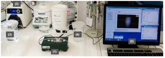 Surface plasmon resonance biosensor system setup. (1) PhotonicSys SPR H5; (2) peristaltic pump; (3) source solution; (4) drain solution; (5) detection software.