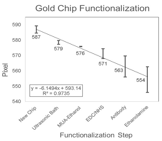 The SPR biosensor mechanism was based on the detection of biomarkers using a functionalized SPR chip. The SPR chip was functionalized with a bio-specific capture entity (antibody) acting as the biomolecular recognition element [49]. The functionalization of the gold SPR chip included the removal of inorganic and organic contaminants with the ultrasonic bath, cleaning and activation using MUA-ethanolic solution to allow the formation of a self-assembled monolayer with carboxyl functional group on the surface, coupling of the antibody onto the substrate surface with EDC/NHS solution, and blocking with ethanolamine. In order to validate the surface modification of the gold SPR chip, the pixel value of DI Water was monitored after each functionalization step (Figure 6). Adsorptions on the gold surface changed the SPR resonance angle θSPR, and consequently the RI of the analyte near the gold layer [67], which resulted in a change in the pixel value measured in the SPR detection system. The pixel value decreased over each functionalization step with the linear equation Y = −6.1494X + 593.14 (R2 = 0.9735). The decrease in pixel value indicated that the SPR dip shifts up and that the SPR resonance angle θSPR increased. This positive shift in the SPR dip occurs when the adsorptive structure was applied on the chip [68]. Therefore, the change in surface chemistry on the chip was validated with the result shown in Figure 6. The results presented were in agreement with the findings from Asta Kausaite et al. [69], who found an increase in SPR resonance angle through the surface functionalization procedure with MUA, EDC/NHS, and Ethanolamine, and Omar et al. [70], who found an increase in SPR resonance angle with the introduction of EDC/NHS onto the chip layer during the immobilization procedure. In addition, these results were also in agreement with Karabchevsky et al. [67], who found an increase in SPR resonance angle following 11-MUA incubation and antibody immobilization on silver SPR chips. To conclude, the pixel negative shift, which is equivalent to an SPR dip positive shift, validated the change of surface chemistry on the gold SPR chip.