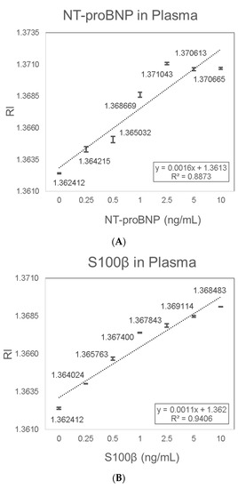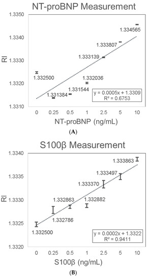 Porcine plasma was used as a medium to mimic the sample environment of human plasma, which is the preferred sample type for diagnostic testing of NT-proBNP and S100β. NT-proBNP detection in plasma showed consistent results with a linear trend of increased RI signal with increasing NT-proBNP concentrations. The increase in RI with increasing NT-proBNP concentrations was characterized by the linear equation Y = 0.0016X + 1.3613 (R2 = 0.8873) (Figure 8A). The LOD of 0.075 ng/mL NT-proBNP in plasma was determined based on the sensitivity (0.0016 (RIU/(ng/mL))) and the average SD (0.00004 (RIU)). S100β detection in plasma also showed consistent results with a linear trend of increased RI signal with increasing S100β concentrations. The increase in RI with increasing S100β concentrations was characterized by the linear equation Y = 0.0011X + 1.362 (R2 = 0.9406) (Figure 8B). The LOD of 0.136 ng/mL S100β in plasma was determined based on the sensitivity (0.0011 (RIU/(ng/mL))) and the average SD (0.00005 (RIU)).