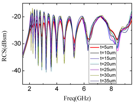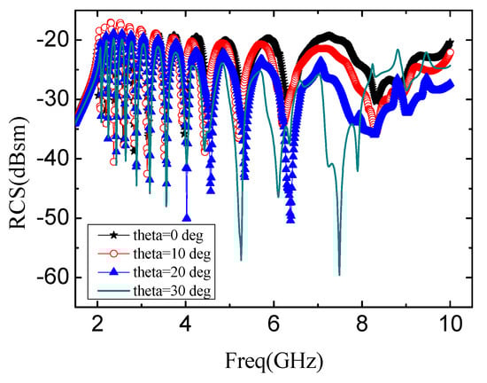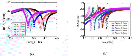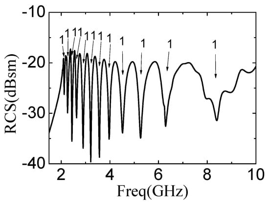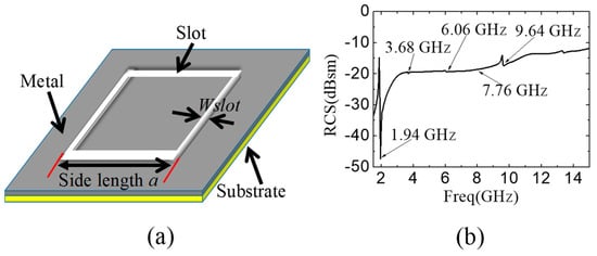 When a notch is shown in the RCS spectrum of the corresponding rectangular slot, the logic state of the code is “1”; while there is not a notch, the logic state of the code is “0.” The different sizes of rectangular slot rings correspond to the different resonant frequency. So, a series of notches are shown at different positions of the spectra. By adding or removing the slot ring resonators of different sizes, the notches of the spectrum are shown in a coding manner.