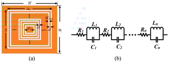 Figure 4b. It shows the equivalent circuit of the proposed resonant slot-patch RFID, in which LC coupled resonator is used to establish the resonant frequency. R indicates the attenuation of the UWB signal. C represents the capacitance of the sealed slot. Its value is proportional to the total length of the slot while being inversely proportional to the width of the slot. L is used to describe the inductance of the metallic strips and its value is also proportional to the total length of the metallic strips while being inversely proportional to the width of the strips. In our design, the equivalent capacitance and inductance are increased significantly because of the convoluted structure that makes both the slot dipole and the metallic strips longer.