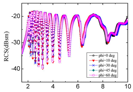 Figure 10 shows the RCS curves on condition that θ = 20° and φ changing from 0° to 60°. The reader can receive data from tag correctly when the tag rotating on the horizontal direction from 0° to 360°, demonstrating directly that the tag shows promising properties acting as RFID since the data in tag can be easily read in wide angle.