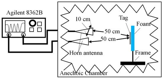 Figure 12 shows the facilities to characterize the fabricated tags, including vector network analyzer (VNA) (model: Agilent E8362B) and two horn antennas (model: LB-8180-NF and LB-10180-NF) acting as transmitting and receiving antennas. The VNA can replace the chipless RFID reader in the laboratory. The distance between Tx and Rx horn antennas connecting the VNA is 10 cm. The chipless tag is fixed on the foam of the frame. The distance between the two horn antennas and the chipless tag is 50 cm.