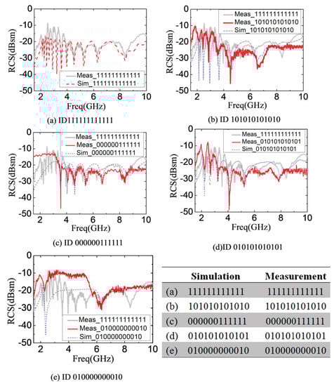 Figure 13b–e indicate the result of simulation and measurement for the other coding tags. The frequency points of the logic ‘1′ and logic ‘0′ are in accordance to the reference tag ID(111111111111) of