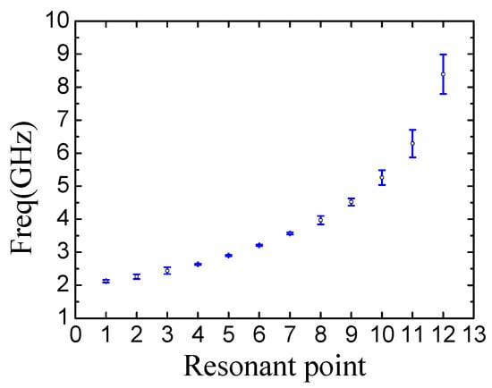 Figure 13a. The resonant frequency points include 2.12, 2.26, 2.44, 2.63, 2.9, 3.21, 3.57, 3.97, 4.52, 5.26, 6.29 and 8.39 GHz.