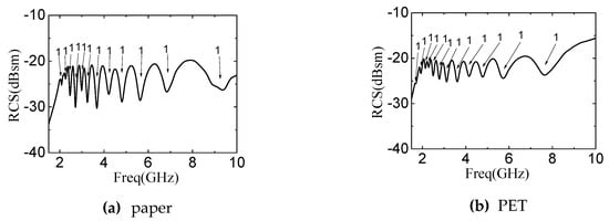 Figure 16. The parameters of paper include the thickness 1 mm, the relative dielectric constant 2.25 and the loss tangent 0.045. The parameters of PET used in simulation include the following: The thickness 1 mm, the relative dielectric constant 3.4 and the loss tangent 0.07. The spectra signature of the paper substrates can show the coding capability of the tag clearly. The corresponding resonant point of the largest rectangular slot ring in