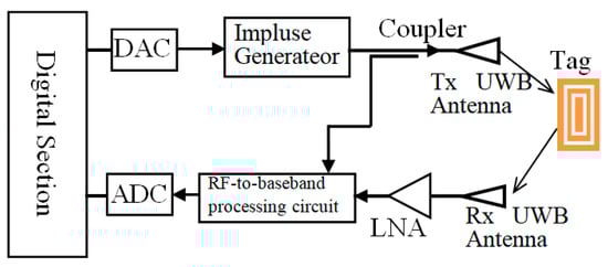 Figure 1. The UWB signal is transmitted to the tag through the radiation of the reader transmitting antenna. The feedback UWB spectrum from the reader is tuned accordingly because of the resonant structure existing on the tag. In this way, the data carried on the tag is encoded into the UWB signal and backscattered to the reader receiving antenna.