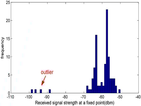 Statistically, outliers are the inconsistent points with respect to the normal data in the data set and will destroy the intrinsic structure of the data set. A typical statistical view of outliers in RSS measurements is shown in Figure 1, which was collected in a real indoor environment at a fixed reference point at different times. All these outliers existing in a fingerprint database will degrade the localization accuracy significantly.