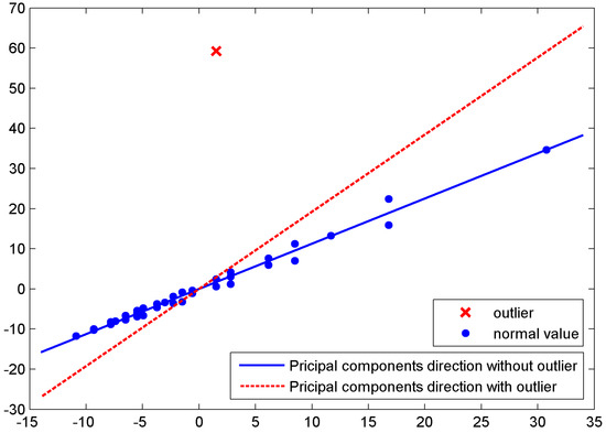 Therefore, after constructing the fingerprint database in the off-line phase, a preprocessing step is needed to deal with the outliers and noise. Otherwise, outliers will lead to wrong feature extraction and affect the estimation in the online localization algorithm such as SVM or KNN technology. As we can see in Figure 2, when outliers exist, the main direction of projection after the Principal Component Analysis (PCA) process has deviated from the correct line seriously, so it is vital to detect and eliminate noise and outliers.