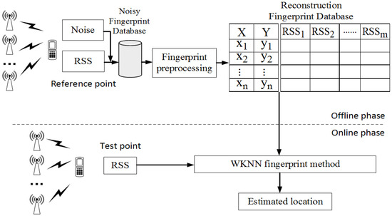 A typical Wi-Fi indoor positioning system involves an off-line phase and an online phase. In the off-line phase, the main purpose is to construct a fingerprint database which indicates the correspondence between RSSs and reference points’ locations. After collecting real-time RSS in the online phase, the users’ locations will be estimated by using some localization algorithms. The system model is shown in Figure 3.