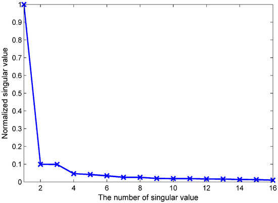 To prove the spatial correlation, we construct an example of the fingerprint database by a logarithmic path loss model. By setting 16 APs and 49 RPs, we can get a fingerprint database . Using SVD decomposition technology, the normalized singular value is shown in Figure 4. As we can see, the first singular occupies the vast majority of energy and the rest of the singular values approach zero. As the rank of the matrix is equal to the number of the singular values, we can see the spatial correlation and low-rank property of the fingerprint database.