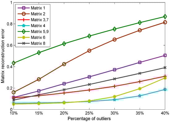 Figure 5 shows the performance with different sizes of merging matrix in a matrix reconstruction error, where the x-axis represents the percentage of outliers and the y-axis represents the matrix reconstruction error. As we can see, the matrix performance in different structures shows great differences; thus, it is vital to select the final size of the merging matrix. Through the analysis of Figure 5, we choose the matrix with size of in the following simulation experiments.