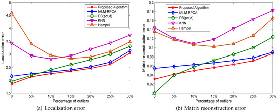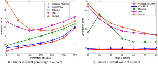 The performance for different values of outliers is shown in Figure 10b, where the x-axis represents the value of outliers and y-axis represents the localization error, and the percentage of outliers is set to . RPCA-based methods change slightly when the value of outliers changes, and our algorithm has a better performance than IALM in all cases, while the , KNN, and Hampel methods cannot handle the situation well when outliers are small.