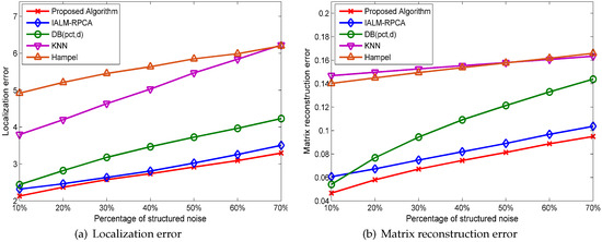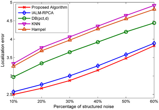 Figure 11 shows the performance of the five methods at different percentages of structured noise rows, while the values of the outliers are generated randomly, ranging from 50 to 100. The percentage of outliers is set to , and the structured noise value is generated randomly, ranging from to 15. We can see that our algorithm has the best performance and that the minimum localization error as the number of structured noise increases.