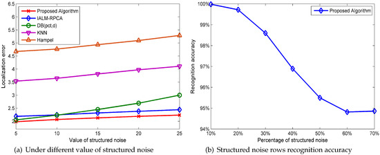 Figure 9a shows the localization error of the five methods for different values of structured noise when the percentage of structured noise is set to . The value p of structured noise means that each element of structured noise is generated randomly form the to p, for instance, the value of the structured noise generated randomly from to 5 when the value is 5. As we can see, the KNN and Hampel methods have poor performances under NOWS while the proposed algorithm has the best performance compared with the other methods in all cases.