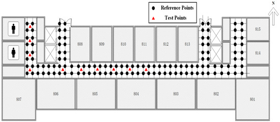 The reference points are set symmetrically with a 1.2 m spacing. There are 126 reference points in total, which are represented by dots in Figure 12. In the off-line stage, we use a TL-WN823N USB wireless network adapter which is compatible with the IEEE 802.11 n/g/b standard. The frequency of the system is operated on 2.4 GHz. We record eight times the RSS information at each reference point, and the sampling interval is 1 s.