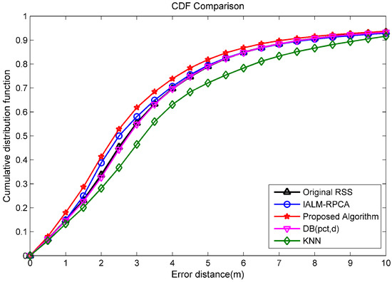 In the online phase, we selected ten test points which are represented by triangles in Figure 12. In order to have enough data to test the localization performance, we scan the RSS information at every test point 100 times, i.e., 1000 users are considered for localization. The Cumulative Distribution Function (CDF) of the localization error for different methods is shown in Figure 13. There are five methods to process the fingerprint database in Figure 13, including the original RSS from a measurement, the proposed algorithm, the IALM algorithm, the KNN method, and the method.