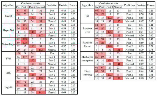 Table 1 demonstrates that random forest and OneR have the maximum and minimum accuracy, respectively. The average overall accuracy of the algorithms is 55.34%, which is low. To investigate the cause of the low accuracy of the algorithms, the confusion matrix was generated and investigated. Figure 1 presents the confusion matrix, precision, and F-score observed from all classification algorithms. The figure is color coded so that as the value of the cell increases, the cell is colored with a darker red.