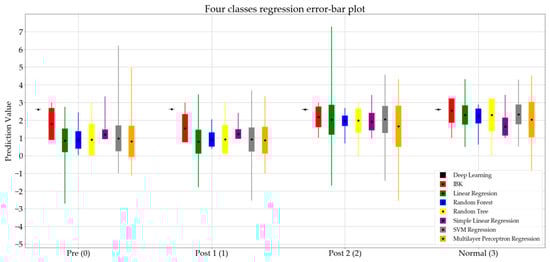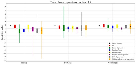 Figure 5 presents the error bar plot of the regression algorithms. In this figure, the pre, post 2, and normal states are represented by the numbers 0, 1, and 2, respectively.