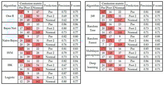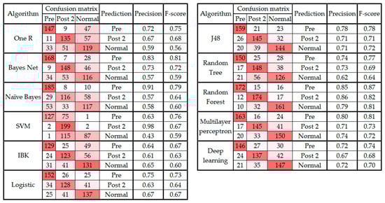 In addition to the classification algorithms, the regression method was used to compare and evaluate each class data on a numerical basis. Here, the pre category was given a base value of 1, post 1 a value of 2, post 2 a value of 3, and normal a value of 4. Table 2 presents the error measures of the eight regression algorithms for the four classes (i.e., pre, post 1, post 2, and normal).