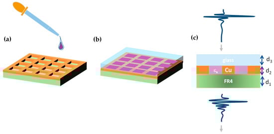 The steps to prepare the CMG for measurements are sketched in Figure 1a,b. First, a liquid analyte was poured on the MS. Subsequently, the cover was placed and pressed in order to obtain the maximum adherence between the two surfaces. This ensures that liquid in excess dropped out of the structure to guarantee that the analyte thickness approximately coincided with d2.
