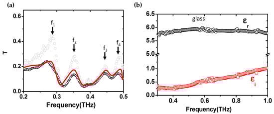 (a) Grey and black circles represent the experimental Terahertz (THz) signal transmission of the bare and capped (without analyte) metagrid respectively. The frequencies f1–4 indicate the most sensitive transmission resonances. The red curve is the full wave simulation of the CMG transmission. (b) Values of the real (black circles) and imaginary (red squares) part of the dielectric function for the cover glass slab vs. frequency up to 1 THz.