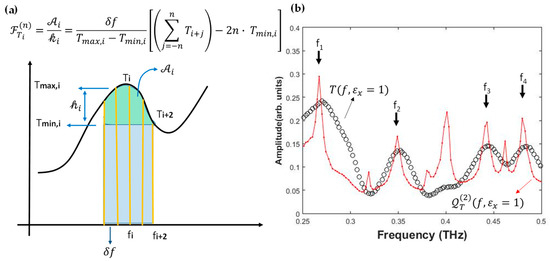 In Figure 3a, a sketch explaining the conceptual meaning of for n = 2 is reported. One can easily see that the quantity in the square brackets of Equation (1) identifies the green dashed area in the figure, so that its ratio with provides a frequency interval not to be mistaken for the resonance width. In this respect represents a gauge of the growth rate of the transmitted signal T(f) “area” and quantifies therefore a “local” figure of merit. It is worth noting that, in spite of the fact that resembles a differential quantity, it is not proportional to the simple T-derivative that actually yields zero in correspondence of extreme points in transmission.