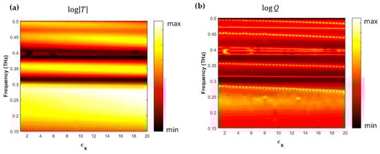 The last expression in Equation (1) highlights that is different from zero only when , which allows the mapping of all extreme points of T in “spikes” having width of the order of . This highlights the main role of that, independently of the intrinsic figure of merit for the selected metagrid modes, maps them in resonances which are directly close to the experimental limit achieved for n = 1, . In our case δf = 5 GHz was given by the experimental sampling interval in the frequency domain, providing therefore maxima in the local quality factor between 20 and 40 in the range 0.2–0.4 THz.