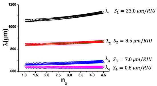In Figure 5, we report as dotted curves the linear calibration curves given in Equation (2) and expressed in terms of wavelength ) versus refractive index . A linear fit of the four curves implies an error that in the worst case (f1) is smaller than 3%. The angular coefficient of each linear fit provides the sensitivity related to each resonance. Estimated values are close to the highest presently recorded in literature [6,35,36] and are reported next to each curve. We argue that the decrease in sensitivity as a function of the resonance order is possibly due to the mode transition from a dipolar (f1) to an hexapolar (f4) character, where the electric field tends to concentrate within the substrate [21], weakening its dependence on analyte change.