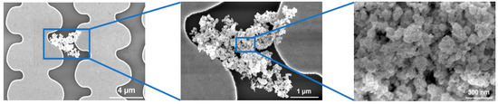 Gold nanoparticle solutions were deposited onto the microelectrode regions of a sensor chip with direct drop-casting. A 2 μL droplet of each type of AuNP was placed at a corner of a sensor chip using a micropipette. The droplets covered the entire active sensing region of the devices. Once the solvent evaporated, the surface of the chip was cleaned by a stream of dry nitrogen gas (99.999% purity). Scanning electron microscope analysis (Verios 460L SEM, Thermo Fisher Scientific, Waltham, MA, USA) was conducted to verify nanoparticle assembly at the microelectrodes.