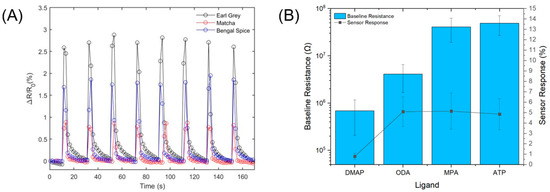 (A) Real-time sensor response profiles for Earl Grey (black tea), Matcha (green tea), and Bengal Spice® (herbal tea) for one sensor element with DMAP-AuNP; (B) Baseline resistance and sensor response variation among four types of organo-capped gold nanoparticles toward Black Cherry Berry (herbal tea).