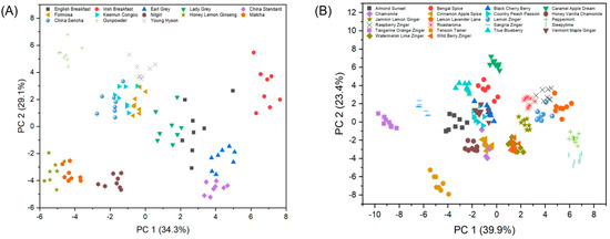PCA plots of (A) eight black teas and five green teas, and (B) 22 herbal teas analyzed with the same sensor chip using four types of monolayer protected nanoparticles.