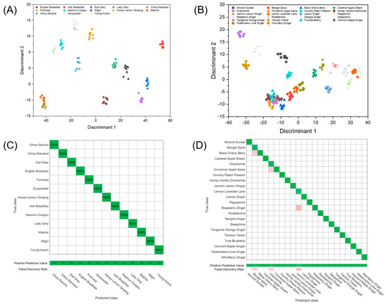 LDA plots of (A) eight black tea analytes and five green tea analytes and (B) 22 herbal tea analytes on the same chip assembled with four types of functionalized gold nanoparticles (38 devices). Confusion matrix shows (C) 100% classification accuracy for black teas and green teas, and 97.7% for (D) herbal teas.