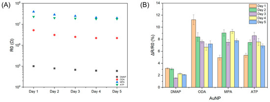 To evaluate sensor stability, a five-day experiment was performed for the classification of black and green tea aromas. Firstly, the baseline resistance of each working device was monitored over time. Figure 6A shows a gradual decrease of baseline resistance, which was larger during Days 1–3 and flattened after Day 4. All sensing materials underwent a decrease in baseline resistance. Sensing profiles on Figure 6B show that for DMAP-AuNP and ODA-AuNP, there was a trend of decreasing sensitivity, but not for MPA-AuNP or ATP-AuNP. This is likely due to the difference in particle morphology changes during the reversible sensing process.