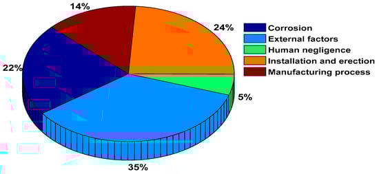 A pie chart of the statistics of the sources of pipeline failure. Data is obtained in [].
