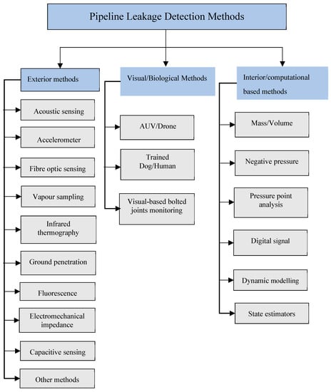 Several pipeline leak detection methods have been proposed during the last decades using different working principles and approaches. Existing leakage detection methods are: acoustic emission [,,], fibre optic sensor [,,], ground penetration radar [,], negative pressure wave [,,], pressure point analysis [,,], dynamic modelling [,], vapour sampling, infrared thermography, digital signal processing and mass-volume balance [,,,,]. These methods have been classified using various frameworks. Some authors have classified them into two categories: hardware and software-based methods [,]. In an attempt to group these methods based on technical nature further research efforts have been made [,,,,,,] which has led to the classification of available leakage detection systems into three major groups, namely internal, non-technical or non-continuous and external methods [,]. In this study, we will classify different methods into the following categories: exterior, visual or biological, and interior or computational methods. A detailed classification of these methods is shown in Figure 2. The exterior approach utilises various man-made sensing systems to achieve the detection task outside pipelines. Moreover, the biological approach utilises visual, auditory and/or olfactory senses of trained dogs or experienced personnel to detect leakage. In addition, the interior approach consists of software based methods that make use of smart computational algorithms with the help of sensors monitoring the internal pipeline environment for detection task. Remote monitoring can be achieved by carrying camera or sensing systems to designated locations by smart pigging, helicopter or Autonomous Underwater Vehicles (AUVs)/drones or using sensor networks [].