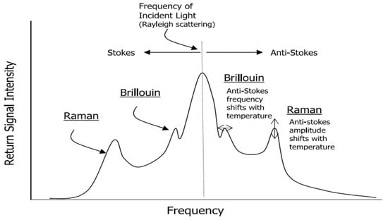 This method involves installation of fibre optic sensors along the exterior of the pipeline. The sensors can be installed as a distributed or point sensor to extensively detect the variety of physical and chemical properties of hydrocarbon spillage along the pipelines. The operation principle of this method is that cable temperature will change when pipeline leakage occurs and hydrocarbon fluid engross into the coating cable. By measuring the temperature variations in fibre optic cable anomalies along the pipeline can be detected []. Distributed Optical Fibre Sensor (DOFS) provides environmental measurements based on three classes of scattering, namely Raman, Rayleigh and Brillouin scattering []. These classifications are based on the frequency of the optical signals as illustrated in Figure 3. Brillouin scattering can measure both strain and temperature but is very sensitive to strain, while Raman scattering is only sensitive to temperature, with greater ability to accurately measure temperature greater or equivalent to 0.01 °C resolution [].
