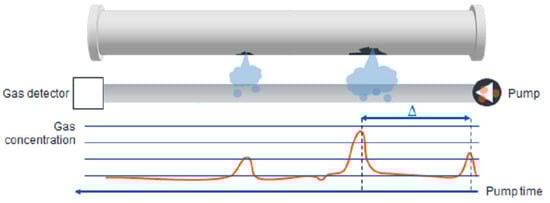 where is the gas constant, is the gas temperature at the orifice, is the molecular weight and represent jetting gas mass flow rate. Both aquaphones and geophones can be used to detect and locate leakage. However, these approaches are not effective due to their slow operating procedures []. The acoustic correlation method is more sophisticated than the abovementioned methods. In this approach, two sensors are required to be positioned on either side of the pipe to detect leakage. The time lag between the acoustic signals when the sensors sense a leak is used to detect and identify the point of leakage [,].