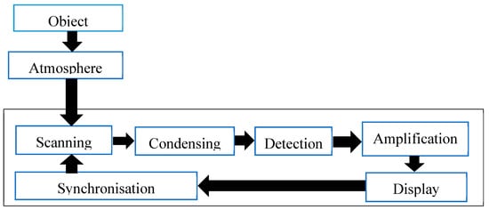Pipeline leakage detection systems based on the infrared thermography (IRT) mechanism are also applicable for the detection of pipelines leakages. IRT is an infrared image-based technique that can detect temperature changes in the pipeline environment using infrared cameras which shows the infrared range of 900–1400 nm []. The image captured using an IR thermography camera is referred to as a thermogram. The basic function of thermography cameras is illustrated in Figure 5. Since changes in temperature measurements are one of the common indications of gas discharge in the pipelines surrounding as gas leaks usually cause abnormal temperature distribution, therefore, using IRT for pipeline monitoring become widely accepted due to its capability to measure temperature changes in real-time and in a non-contact manner [,]. IRT as a contactless and non-invasive condition monitoring tool is also applicable for various condition monitoring applications such as heat transfer [], tensile failure [], concrete and masonry bridges [].