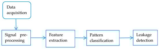 In digital signal processing approaches, the extracted information such as amplitudes, wavelet transform coefficients and others frequency response is employed to determine leakage events. Generally, pipeline leak detection using digital signal processing involves five steps as illustrated in Figure 9. The steps are as follows: (1) initially internal sensors measure in-pipe pressure or flow; (2) After data acquisition, the acquired data is pre-processed to filter the background noise for efficient feature extraction; (3) In the feature extraction step, various statistical, spectral and signal transform techniques are employed to extract relevant features to monitor the state of hydrocarbon fluid transport in the pipeline; (4) The pattern of the extracted feature is compared with the known pre-set signal or previous features for decision making; (5) Leakage detection is achieved through the comparison of the pattern with the threshold.