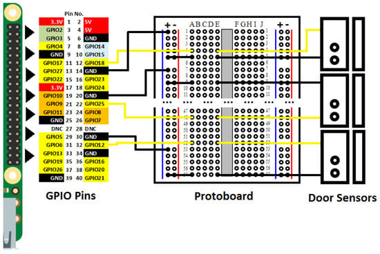 Each door sensor had two wires and, due to their specification, one of these wires needed to be connected to ground and the other one needed to be connected to some input. Pins GPIO 18, GPIO 12, and GPIO 25 were chosen as input pins; pins GPIO 14, GPIO 20, and GPIO 30 were selected as ground pins. These choices were mainly arbitrary, and we only considered that chosen pins with inputs/outputs had a ground pin next to them. Because wires of door sensors could not be directly connected to the Raspberry Pi, we connected these through a protoboard by means of jumper wires. As one can observe in the schematic design, all ground pins were connected through jumper wires to the positive power line of the protoboard (representing this connections with black lines). Then, in order to ensure the connection continuity until the door sensors, a jumper wire was placed from the power line to the central segment of the protoboard for each sensor. In the schematic design, these connections are represented with black lines that go from the “+” column to the “A” column. Finally, door sensors were connected to the circuit through column “E”. It was necessary to use one or several jumper wires in this last step, depending on the distance from the protoboard to each door sensor. Input GPIO pins were directly connected to the protoboard through the central segment, then door sensors were connected with them through the same central segment (represented with yellow lines).