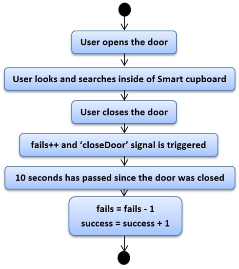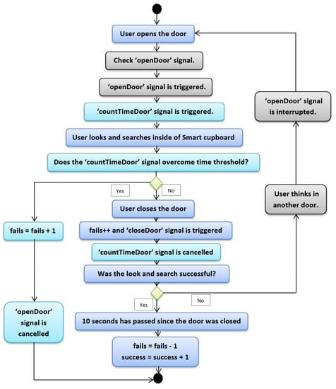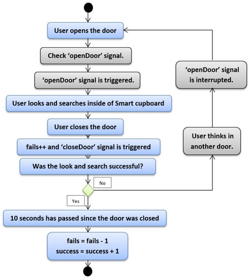 Figure 6 depicts the third case. The beginning is the same as aforementioned cases, only with the difference that another signal is triggered when the door is opened by the user; this signal is called “countTimeDoor” (we have not mentioned the signal before in order to avoid over-long explanation, but it was also present in the previous cases). The signal’s aim is to start to count the time that an SC door is held open. This period of time matches with period of time the user is searching an object inside of the SC. The assigned threshold for this signal was 10 s, that is, the user has 10 s to find the item, and if this time is surpassed the system increases the fail counter. We determined the threshold of the “countTimeDoor” signal in the same way as we determined the 10 s in order to know whether user was successful (i.e., through experiments made by ourselves and other users), until we were able to determine a proper threshold. We assume that the user overcame the signal threshold, so the fail counter increases. Furthermore, the “openDoor” signal is canceled, since if it were not so, when the user closed the door again, our system would increase the fail counter once again. Finally, it is worth mentioning that if the user closes the door before 10 s, the “countTimeDoor” signal is canceled in order to avoid increasing the fail counter twice.