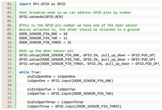 The algorithm was written in Python, and for the sake of reproducibility, we describe how the implementation of this algorithm handled the pins. In order to manage pins inside the script, we used the RPi.GPIO library. There were two options to enumerate the pins. The first was GPIO mode, in which each pin had the same number as their physical position, hence pins were enumerated from 1 to 40. The second option was BCM (Broadcom mode), in which pins were numerated in order to match with Broadcom chip, which was the CPU (central processing unit) of the Raspberry. We used BCM for the implementation of the presented algorithm. The algorithm implementation also needed to set up some pins as input pins, and this was achieved with the predefined function GPIO.setup. Finally, the GPIO.input function provided the current state of each door sensor, true when the two pieces of a door sensor were separated (i.e., the door was open), and false otherwise. Figure 7 presents an excerpt of the Python implementation used in the SC, showing the aforementioned implementation details about pins. Door sensor states were used as previously described when presenting the algorithm.